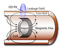 Defects with abrupt boundaries such as pits or cracks produce a leakage field which rises above both the inside and outside surface of the tube. Inside the probe head are detection coils, in which a voltage is produced as they pass through a leakage field. For damage such as gradual wall loss or bulges where a leakage field wouldn’t be produced. A Hall Effect sensor is used to detect changes in the flux density produced by the magnet.